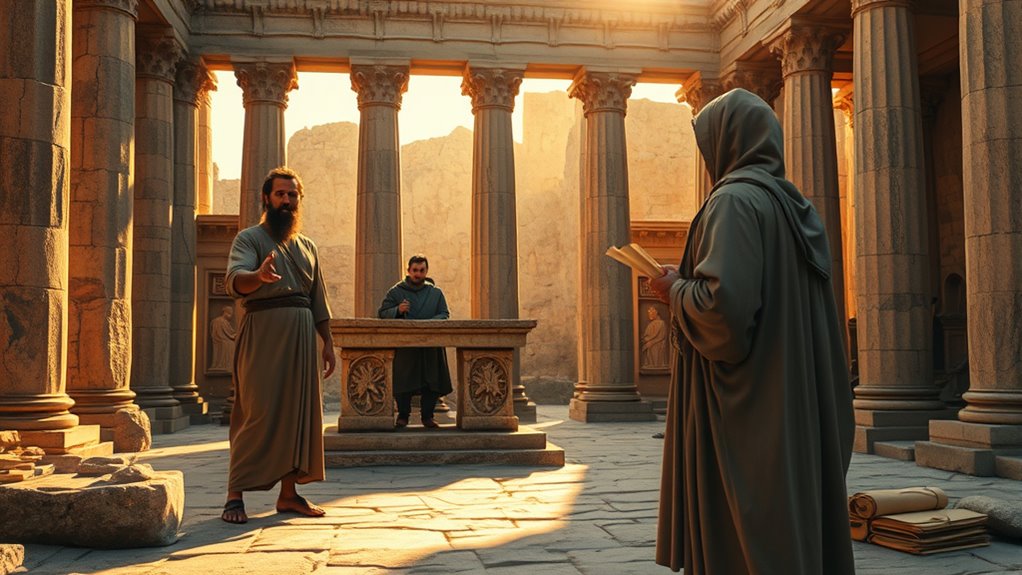 In ancient debates about oracles, philosophers rely on reason, evidence, and rational inquiry to verify truth, arguing that claims must be tested and scrutinized. Prophets, meanwhile, trust divine revelations and spiritual insights, asserting their authority through divine connection beyond human questioning. This clash highlights contrasting views: rationalism versus divine authority. To understand how these perspectives shaped beliefs about truth and morality, explore further into the core differences that define their ongoing influence.
