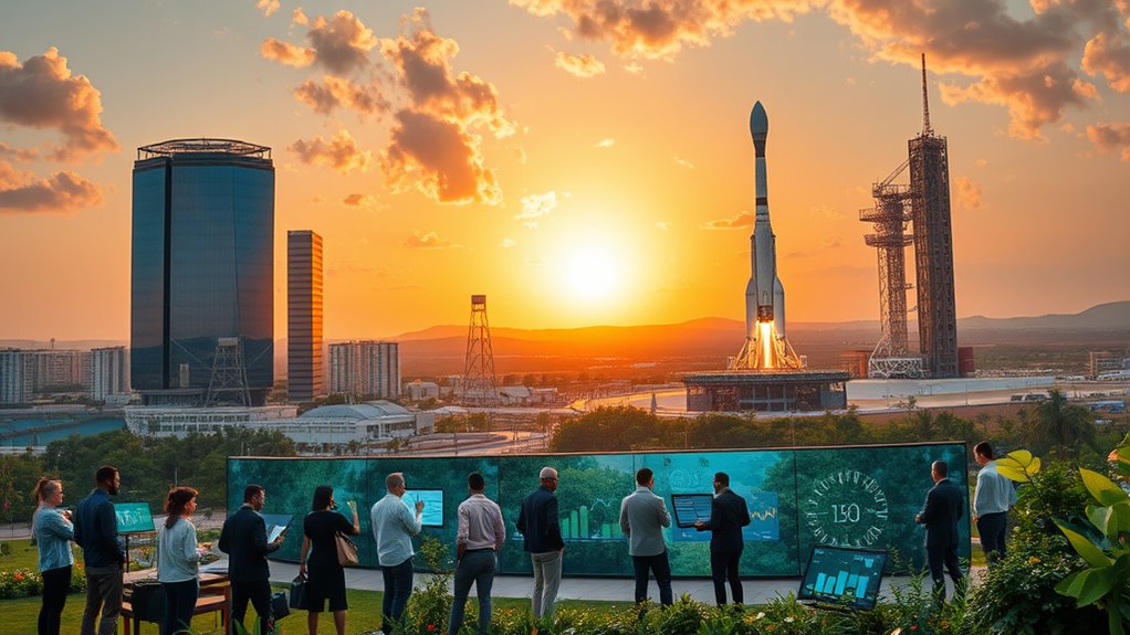 In 2025, you’ll see Africa rapidly transforming through its expanding tech hubs, innovative space programs, and strong economic growth. Countries are investing in smart city infrastructure and renewable energy, creating opportunities for startups and entrepreneurs. Space initiatives are positioning the continent as a new frontier for science and exploration. This growth is reshaping Africa’s future, offering exciting prospects for development and collaboration—if you keep exploring, you’ll discover even more about this remarkable rise.