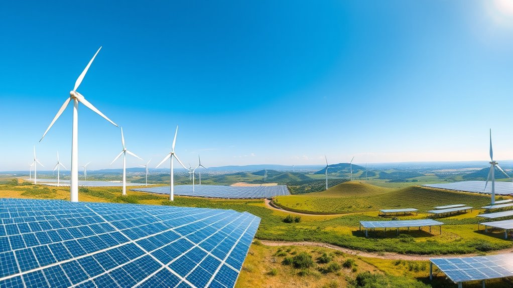 By 2025, solar and wind power will lead the global shift toward renewable energy, with technological advances and falling costs making them more accessible. Strong government incentives and policies will accelerate adoption, while innovations in energy storage ensure reliable supply even when the sun isn’t shining or wind isn’t blowing. This progression supports efforts to reach net-zero emissions. Keep exploring how these changes are shaping a cleaner, more sustainable energy future for everyone.