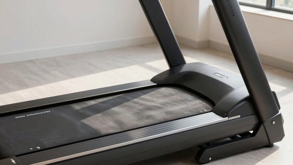 Think of your folding treadmill as a car—regular maintenance keeps it running smoothly. You should follow a lubrication schedule to prevent belt wear and guarantee quiet operation. Always check the safety lock features to confirm they function properly before use. Wipe down the deck after workouts to remove sweat and dust, and inspect for loose bolts. Consistent maintenance keeps your treadmill safe and extends its lifespan, making every workout safer and more enjoyable.