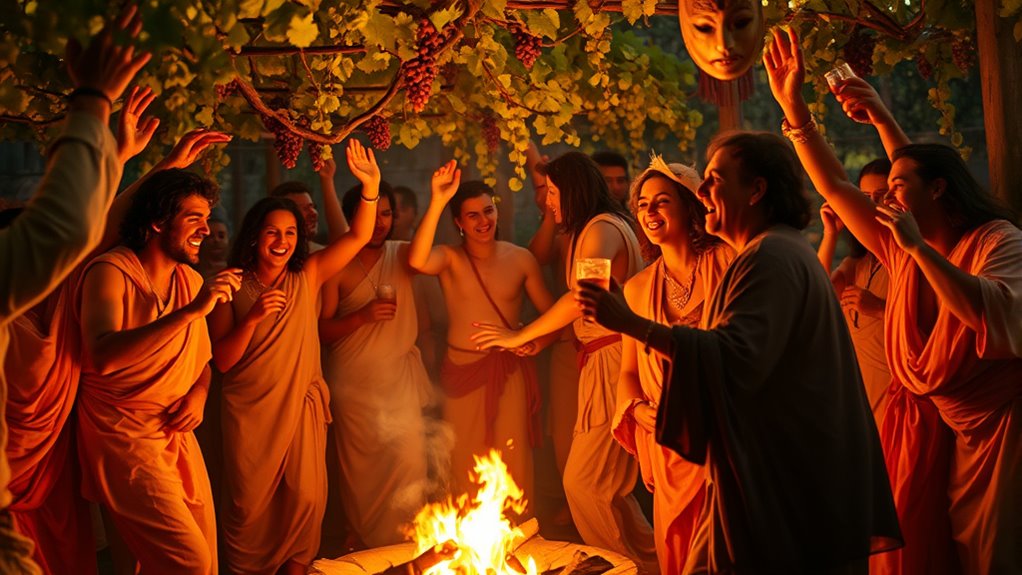 The rituals honoring Dionysus are designed to break down social constraints, encouraging spontaneous expression and collective joy. During these ceremonies, you may find yourself caught up in a frenzied rhythm, losing track of time and self-awareness. The ecstatic dance becomes a communal act, a shared experience that unites everyone in a celebration of life’s most exhilarating aspects. Through movement and music, you enter a trance-like state that allows you to access deeper emotional layers, releasing pent-up tensions and embracing unfiltered passion. This collective joy isn’t just entertainment; it’s a spiritual act of liberation, a temporary escape from the mundane confines of daily life.