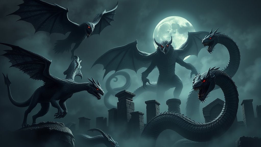 You see dark folklore symbols like jagged claws, glowing eyes, and twisted figures that embody fear and mystery. These beings often carry talismans or are depicted with moonlit shadows, representing spiritual symbolism tied to the unknown and the supernatural. These symbols evoke a sense of eerie power, connecting you to ancient fears and legends, reminding you of the unseen forces lurking beyond the veil of everyday life.