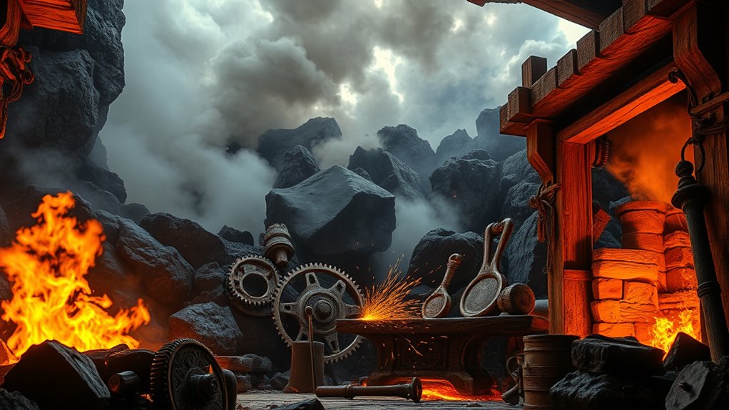 Like a spark igniting a flame, you understand Hephaestus invented ancient tools through metalworking innovations. His mastery of fire and forge led to groundbreaking tool development origins, transforming raw materials into intricate weapons, jewelry, and machinery. He harnessed volcanic energy and his divine craftsmanship, shaping innovations that laid the foundation for civilization’s technological progress. His inventive spirit turned molten metal into the building blocks of human progress, forging a legacy that endures today.