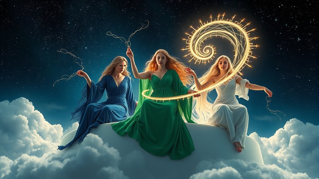 As you reflect on the Three Fates, remember they’re the silent weavers of your life’s tapestry, their threads spun from destiny’s loom. Their ancient hands guide every twist and turn, unseen yet unstoppable. Like stars charting your course across the night sky, they shape your story with gentle but unyielding precision. Embrace the mystery of their craft, for in their woven fabric, your fate is both a work of art and a voyage of discovery.