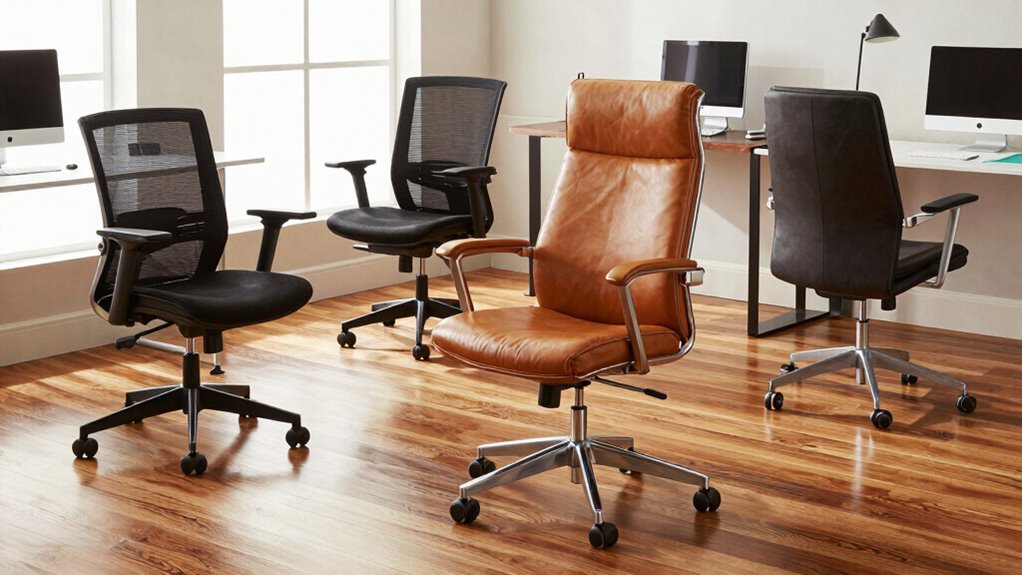 Choosing the right floor protection when selecting a desk chair for hardwood floors can considerably extend both your floors’ and your chair’s lifespan. Built-in or compatible floor protection features, like caster wheels designed for hard surfaces, help prevent scratches, dents, and scuffs. Chair mats made from durable PVC or similar materials add an extra layer of defense against damage from wheels or caster impacts. Opting for polyurethane or rubber wheels specifically designed for hardwood floors reduces surface scratching and allows for smoother movement. Non-slip backing on mats or chairs guarantees stability, preventing accidental slips that could harm your floors. Regular maintenance and choosing floor-friendly accessories further prolong the life of both your hardwood and your chair, making protection a key consideration in your selection process.