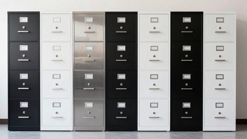 When choosing a filing cabinet with a lock, I focus on security features that keep my documents safe and the size that fits my space and storage needs. I also consider the material’s durability to guarantee it lasts over time and the type of lock that offers the right balance of security and convenience. Finally, I think about mobility and placement, making sure the cabinet can be easily moved or positioned where I need it most.