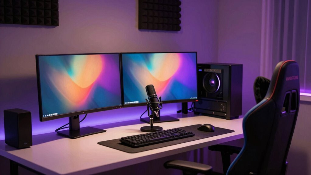 Adjusting the color temperature markedly impacts your streaming ambiance. Cooler temperatures (around 5600K) create a crisp, professional look, perfect for clarity, while warmer tones (around 3200K) add coziness and a more inviting feel. I always tweak my lights to match my content’s mood, ensuring viewers feel immersed. Small adjustments can make a big difference, helping me set the perfect atmosphere and keep my audience engaged.