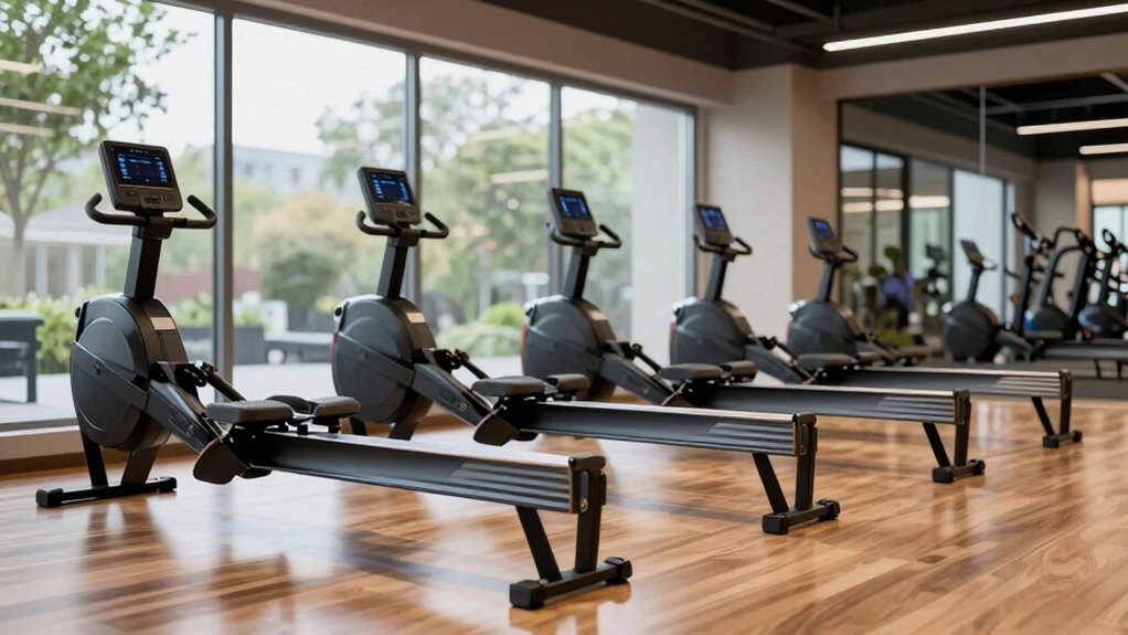 Choosing a space-saving magnetic rowing machine means prioritizing compact design features that fit seamlessly into your home. Many models have foldable or vertical storage options, reducing their footprint when not in use. Usually under 1.5 meters long, these rowers can be stored upright or folded to occupy less than 0.3 square meters. Built-in transport wheels make moving and repositioning easy, even in tight spaces. Dual-rail or foldable structures enable quick setup and storage, perfect for small apartments or multi-purpose rooms. Designing with slim profiles or vertical folding maximizes available space without sacrificing workout quality. These features guarantee your equipment doesn’t dominate your living area, making it simple to integrate effective exercise into your daily routine, regardless of space limitations.