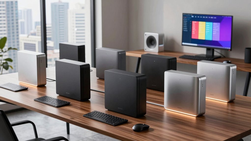 If you’re looking for the 9 best mini PCs for your home office in 2026, I recommend options like the TUREWELL HSI with 16GB DDR5 for multi-display productivity, the KAMRUI Pinova P2 featuring 16GB RAM and a 512GB SSD, and the compact Lenovo ThinkCentre M910q. The Beelink SER5 MAX with Ryzen 7 offers powerful performance, while others like the GMKtec Mini PC suit creative tasks. For all the details on these top picks and what to take into account next, keep exploring.