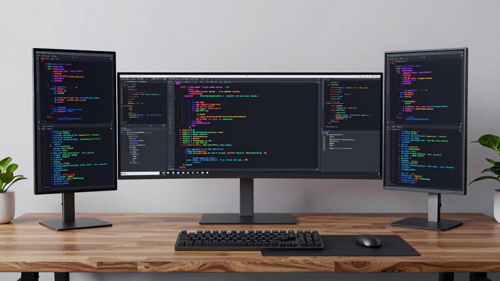 Having the right connectivity options on your monitor is essential for a streamlined coding setup. Multiple input ports like HDMI, DisplayPort, and USB-C guarantee you can connect various devices without hassle. USB-C is especially useful for single-cable setups that transmit video, data, and power, cutting down on clutter. Compatibility with older ports such as VGA or DVI can be helpful if you work with legacy equipment. Built-in USB hubs with multiple ports also boost productivity by enabling easy connection of peripherals directly through the monitor. Finally, confirm that the ports support your desired resolution and refresh rates for smooth multitasking and peak coding performance. Choosing a monitor with versatile connectivity ensures a seamless, efficient workspace.