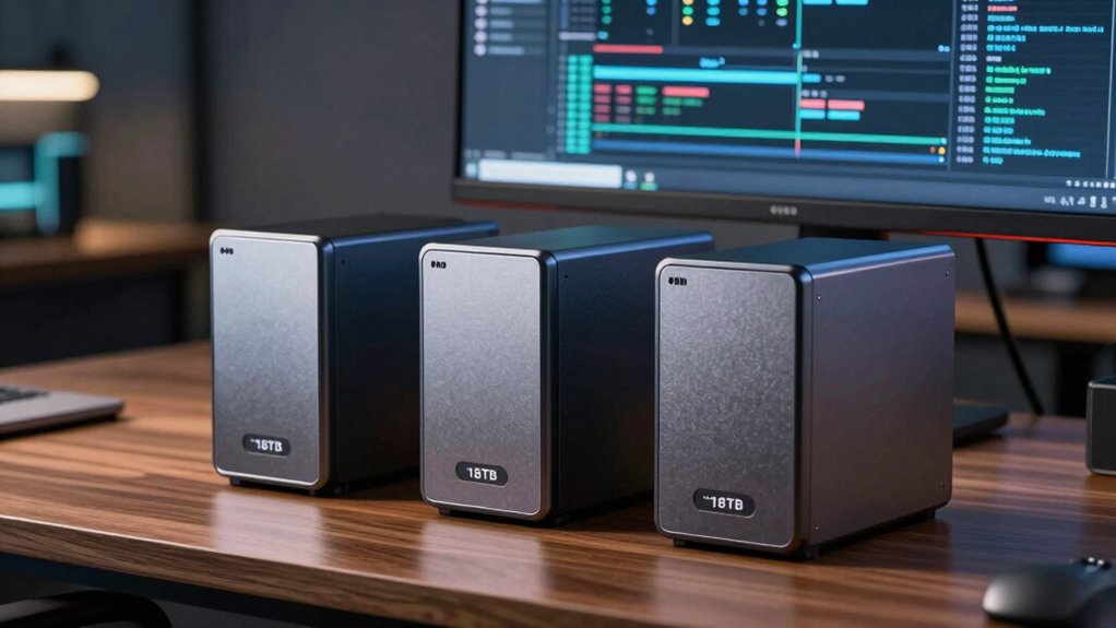 I recommend upgrading your 18TB NAS hard drives every 3 to 5 years. This timeframe helps guarantee you’re protected against drive failures and data loss, as drives can wear out over time. I’d also keep an eye on SMART data and performance signs. Regular backups are essential, so even if you don’t upgrade immediately, you’re covered. Staying proactive keeps your NAS running smoothly and your data safe.