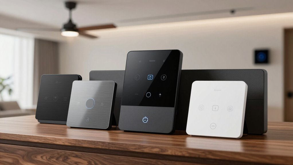 Selecting a smart ceiling fan controller involves considering the control methods that best fit your lifestyle and existing setup. You can choose from wall switches, remote controls, smartphone apps, or voice commands. Some controllers feature manual buttons or touch panels directly on the device, offering quick local control. Voice compatibility with platforms like Alexa, Google Assistant, or Siri allows for hands-free operation, which is especially convenient. Smartphone apps give you remote access, scheduling, and automation, but often require Wi-Fi or Z-Wave connectivity. Your choice impacts ease of use, how well it integrates with other smart devices, and overall convenience. Think about which method suits your daily routines and tech preferences to guarantee seamless control and maximum comfort.