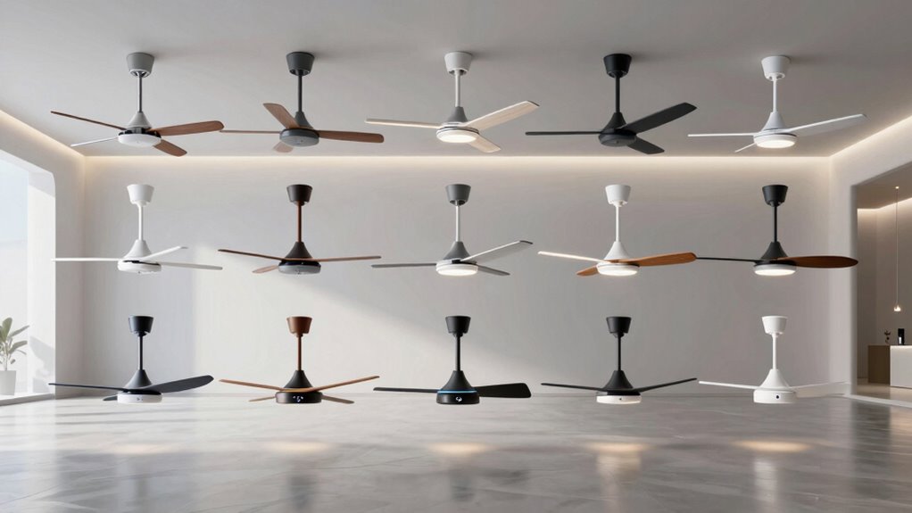 Have you considered how your ceiling’s height and structure might influence which smart fan will fit and function properly? If your ceiling is high or slopes up to 15°, you’ll need a fan compatible with longer downrods, like 10 or 24 inches. Ensuring your ceiling can support the weight, especially for larger or outdoor models, is essential for safety. Check that your electrical wiring matches the fan’s voltage and amperage requirements—most prefer 120V AC. Also, review whether the installation is straightforward, whether it comes pre-assembled, and if you’ll need extra tools. Ultimately, confirm that the fan’s control system works with your smart home setup, and that the necessary app or remote is included. Proper planning saves you time and guarantees safe, seamless operation.