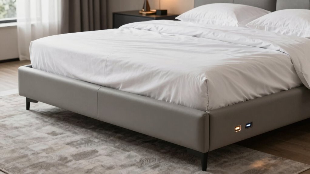 Built-in USB ports in split king bed bases add a layer of convenience that’s hard to beat. They let me charge my devices without cluttering the nightstand with extra adapters or cords. Many models include both USB Type-A and Type-C ports, so I can connect a wide range of modern gadgets, from smartphones to tablets. These ports are usually positioned near the head area, making it easy to plug in devices while lying in bed. Having multiple USB ports on each side means both partners can charge their devices simultaneously without hassle. This feature not only keeps my bedside area tidy by reducing cable clutter but also guarantees my devices are always ready when I need them. It’s a simple upgrade that considerably improves bedroom convenience.