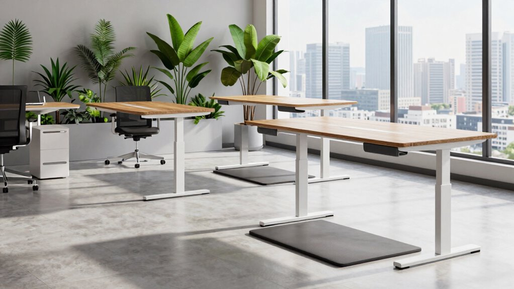 If you’re looking for the best standing desks for back pain in 2026, I recommend models like the Veken 55-Inch Electric Desk and Flexispot height-adjustable options. These desks feature easy height adjustments and sturdy frames that help maintain good posture. Support accessories like anti-fatigue mats and ergonomic chairs are essential too. Want to discover more about choices that can truly enhance your comfort and support your back? Keep exploring for detailed insights and tips.