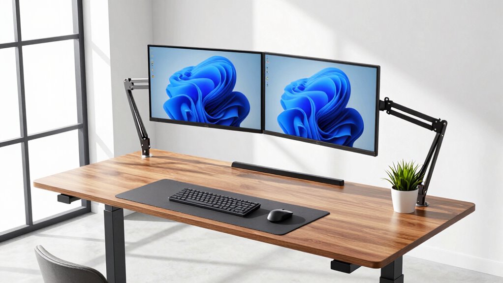 Yes, there are weight limits for dual monitor setups, and they vary by desk. Most standing desks can support between 25 to 100 pounds, but it’s crucial to verify the manufacturer’s specifications. Overloading a desk can cause instability or damage. I always recommend measuring your monitors’ combined weight and comparing it to your desk’s limit to guarantee safety and durability.